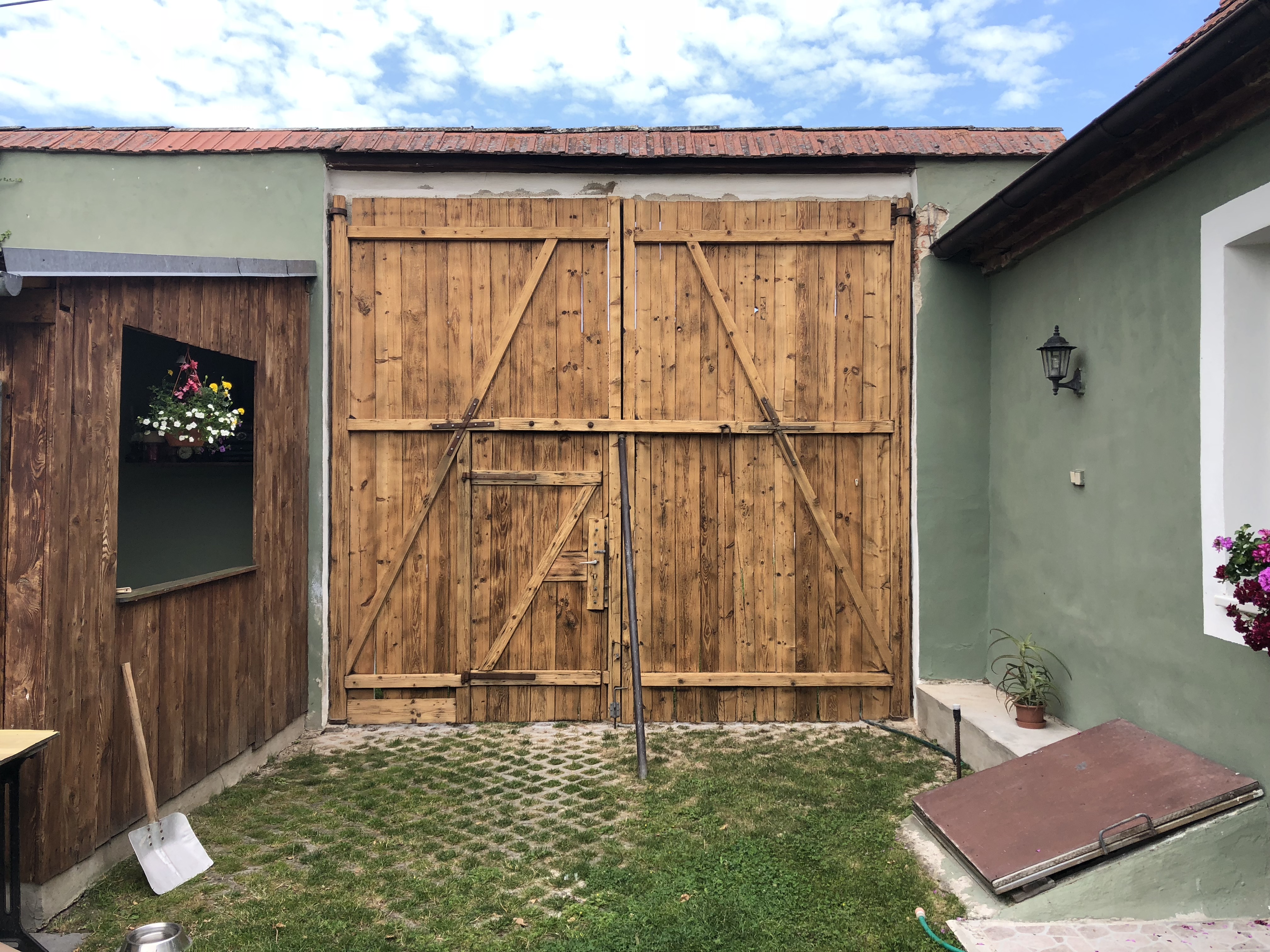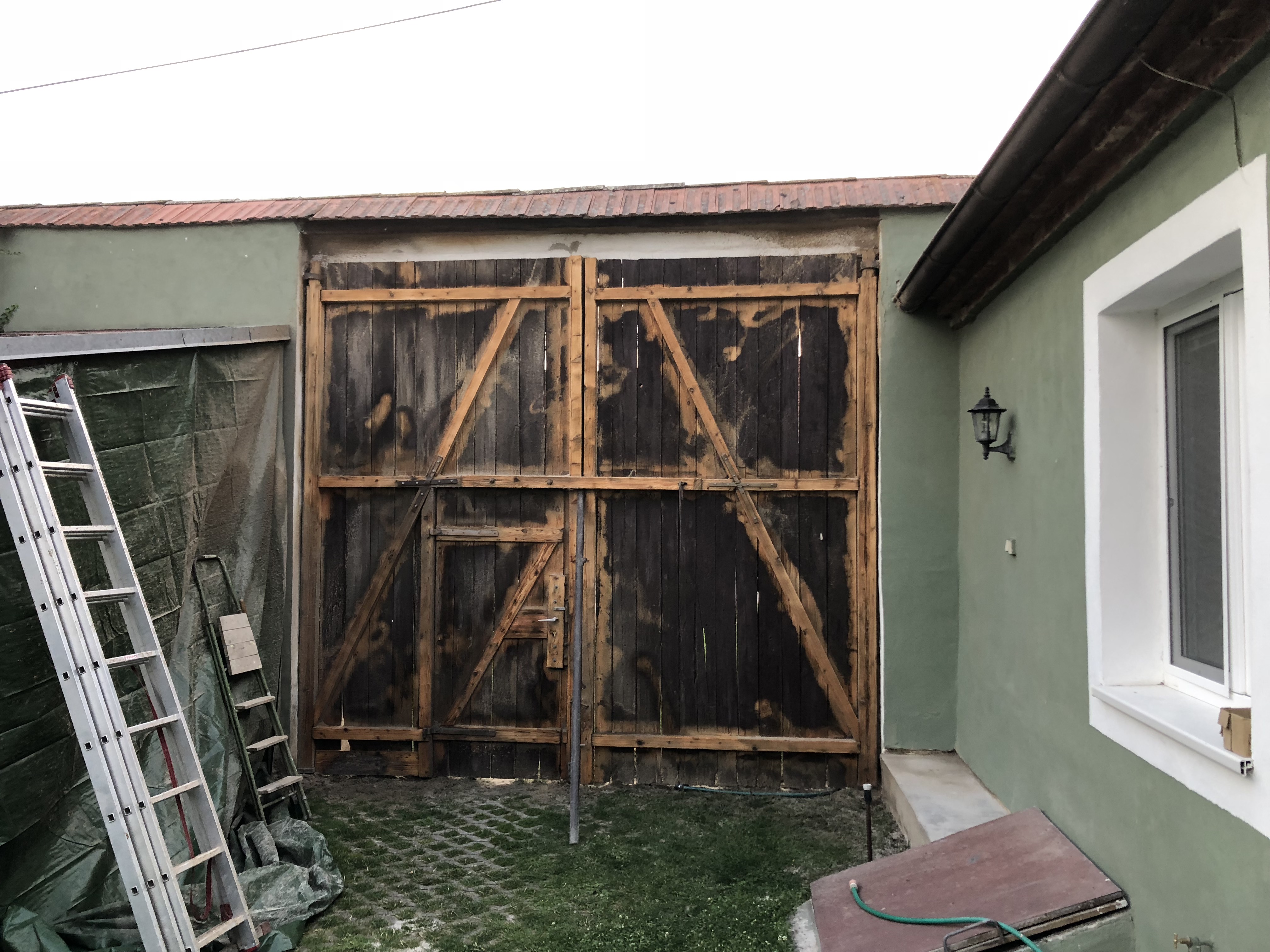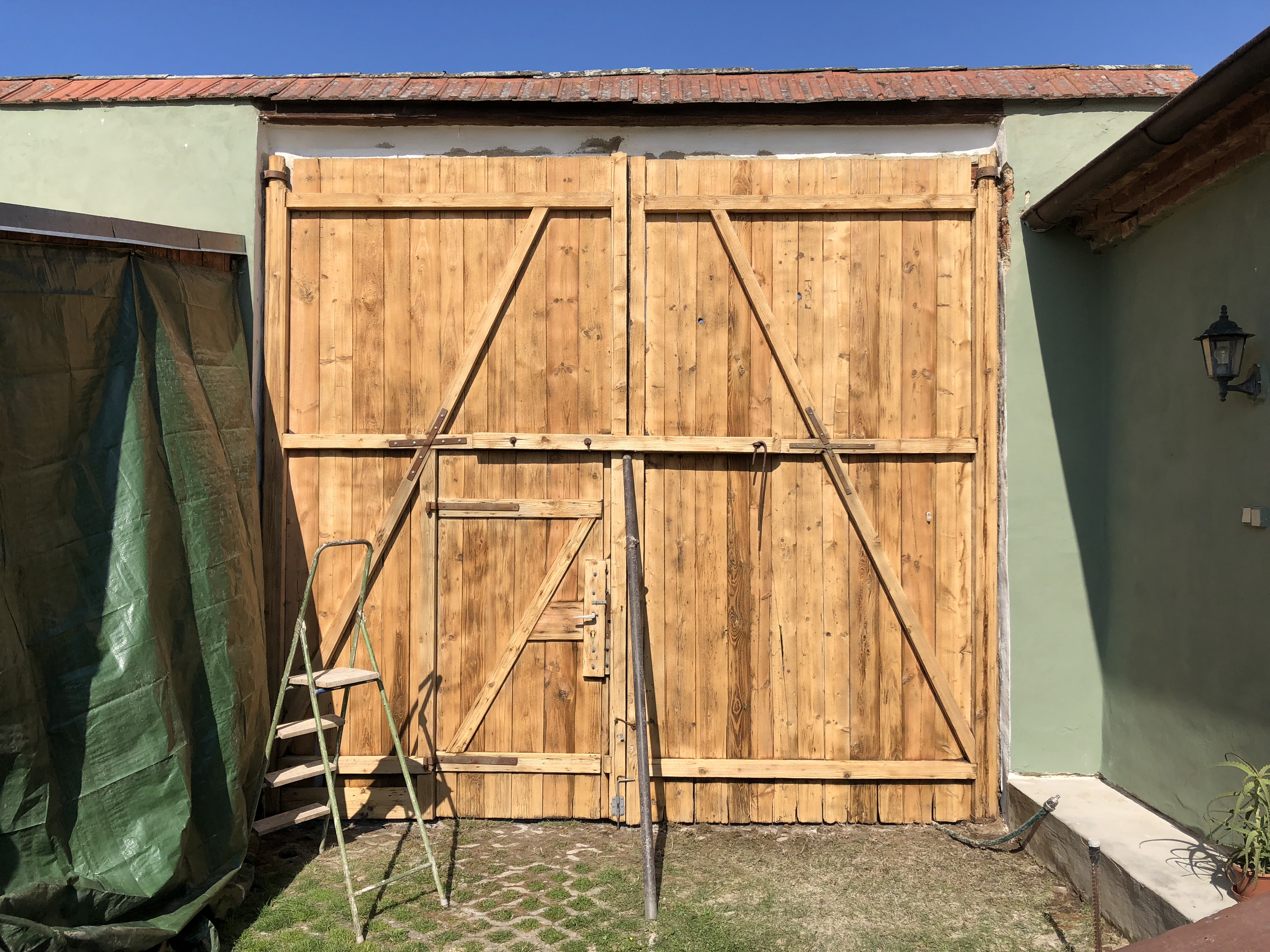 Provedli jsme otryskání starého nátěru z dřevěných vjezdových vrat. Poté aplikovali základní a vrchní ochranný bezbarvý nátěr.